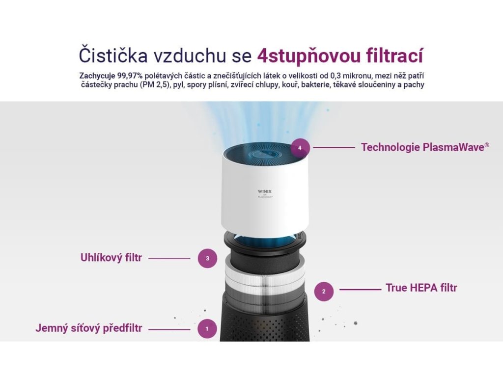 - Four-stage filtration with an efficiency of 99.97% (360° All-in-one filter: pre-filter & True HEPA filter & carbon filter, PlasmaWave®).