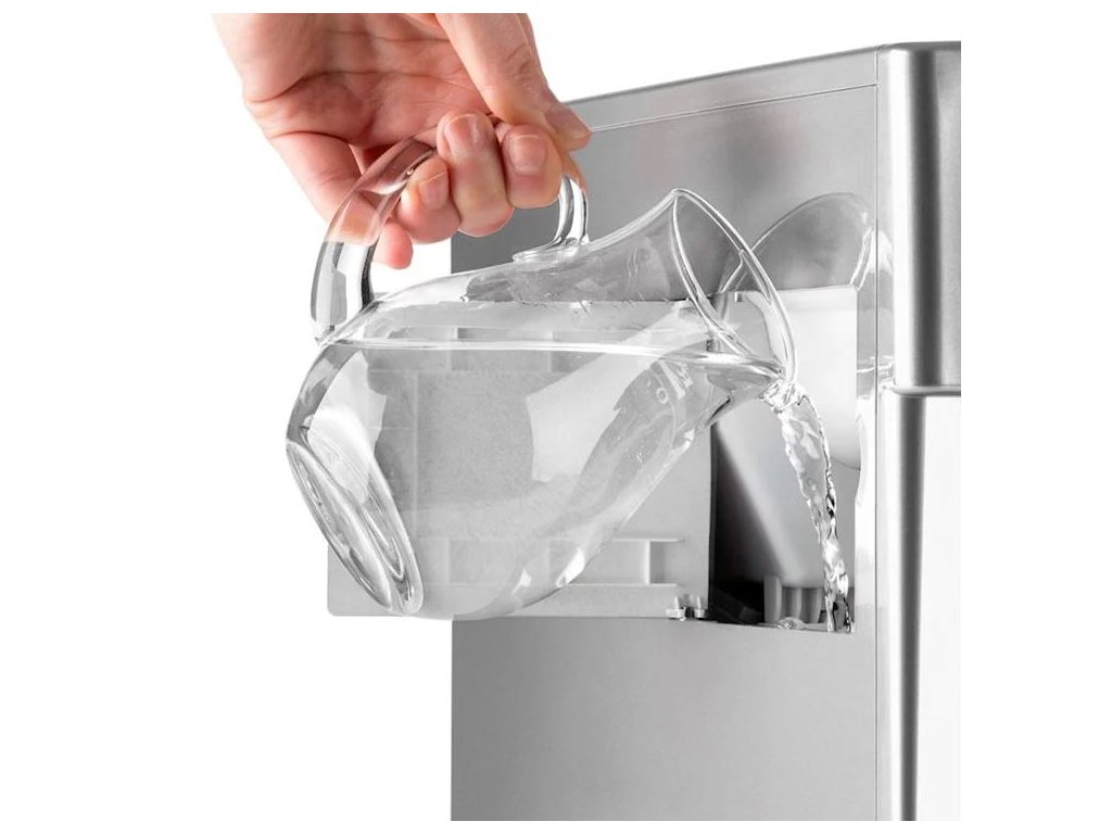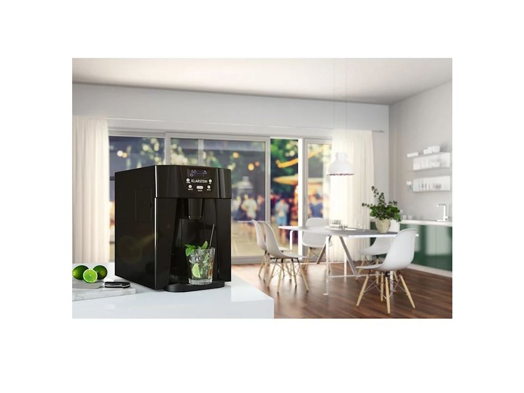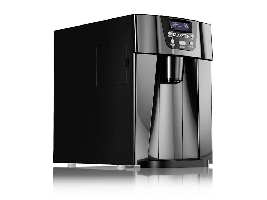 The ice dispenser is not required to be connected to a water supply – it has its own water reservoir where you simply pour water. When the ice reservoir is full or the water level is too low, a safety alarm sounds. The amount of ice can be monitored through a transparent window.