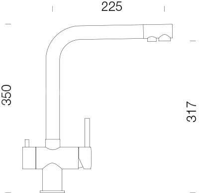 Three-way faucet for filtered and tap (hot and cold) water. The filtered water system is in one arm, where it is separated from the hot and cold water with its own water outlet. The faucet includes two ceramic cartridges and an aerator to ensure water savings. The package also includes components for connection.