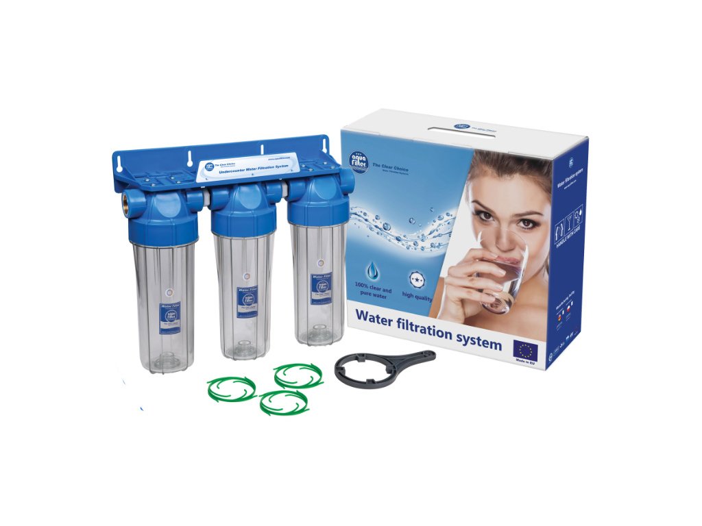 TRIO Filtration Set combines three transparent plastic tubes for inserting any filter cartridges in size 10". It installs directly on the water supply pipeline (cold water inlet). The transparent filter body allows easy visual inspection of the filter cartridge's contamination. This set is designed for mechanical filtration (removing sand, mud, sludge, rust, etc. from water). The air-release button makes it easy to remove air after changing the cartridge.